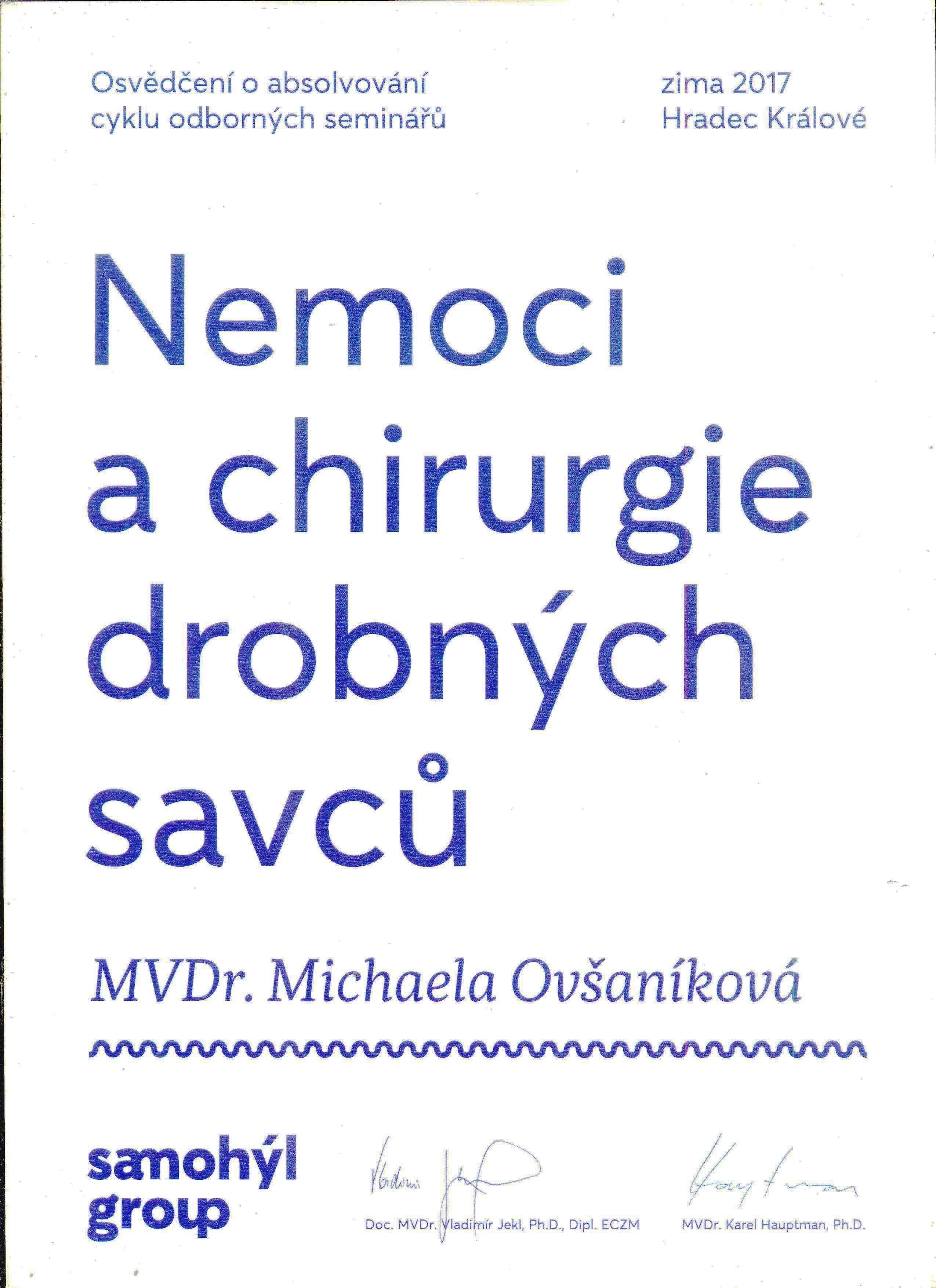 Z důvodů vzrůstající popularity chovu drobných savců(ježci,křečci,morčata,atd) jsme se našem  pracovišti rozhodli  přejít od laciné medicíny náhodného pokusu a omylu k medicíně sice o něco dražší nicméně  skutečně erudované a sofistikované.Specializovaným odborníkem v rámci naší praxe se na drobné savce stala MVDr.Michaela Ovšaníková, která za tímto účelem absolvovala cyklus seminářů organizovaných KVLČR ve spolupráci se Samohýl group.s.r.o.Provádíme drobné i větší chirurgické výkony(kastrace,odstranění tumorů,atd.), ošetřujeme oblíbená onemocnění dutiny ústní,přerůstání zubů,atd.Provádíme odběry krve a jejich specializovaný rozbor,rtg i sono vyšetření.